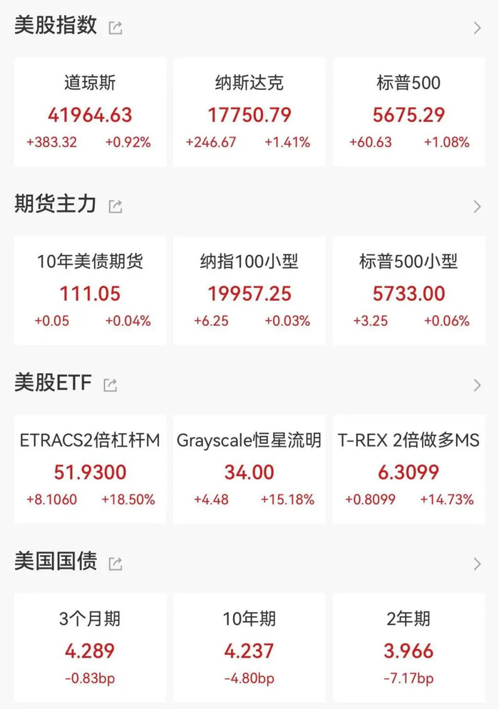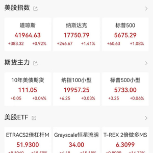 美联储会议结果公布后,美股市场情绪明显回暖。道琼斯工业平均指数上涨383.32点,涨幅0.92%,收于41,964.63点;标普500指数上涨1.08%,收于5,675.29点;纳斯达克综合指数表现最强,涨幅达1.41%,收于17,750.79点。