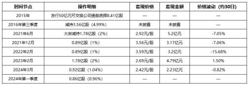 2024年一季度:减持0.86亿股(占比0.96%),持股进一步降至14.92%。值得一提的是,除2024年一季度报告外,投资快报记者并未找到本次减持的相关减持公告。