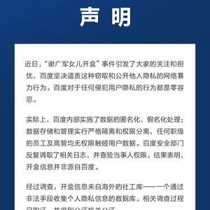 3月19日晚间,百度就“谢广军女儿开盒”事件发表声明称,百度坚决谴责这种窃取和公开他人隐私的网络暴力行为。百度对于任何侵犯用户隐私的行为都是零容忍。