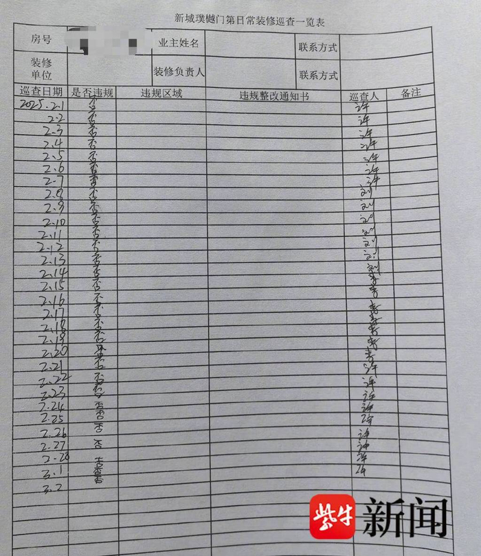 从李女士提供的施工现场图中记者看到,该别墅区楼栋一楼的结构与涉事房屋确实有所不同,施工现场绿化带被挖开,地面以下的主体结构延伸至外立面柱体以外,而坠落事件正是在这片区域中发生。该施工是否改变了建筑原本的地下结构?记者尝试联系璞樾门第物业,但电话一直无法拨通。在一份涉事房屋“日常装修巡查一览表”中,记者看到,从2025年2月1日至2025年3月2日,“是否违规”一栏均由巡查人填写为“否”。
