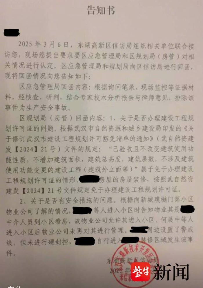 记者了解到,3月13日,武汉东湖新技术开发区有关部门就此事件作出了《告知书》。《告知书》显示,排除该事件为生产安全事故。根据武汉市自然资源和城乡建设局印发的《关于修订武汉市建设工程规划许可豁免清单的通知》(武自然资建发【2024】21号)文件的规定:“已验收且不改变建筑使用功能性质,不增加建筑面积,建筑总高度,建筑层数,不涉及建筑使用功能变更的建设工程(建筑外立面等)”属于免于办理建设工程规划许可证的情形。涉事房屋的房屋装修,按照相关规定免于办理建设工程规划许可证。根据向新城璞樾门第小区物业公司了解的情况,何先生等人进入小区时告知物业其是中介人员到小区看房,故物业公司允许其进入小区。何先生等人进入小区后,物业公司未再对其进行管理。涉事房屋周边设置了警戒线,但未进行硬封控,何先生自行进入装修区域发生该事件。