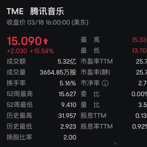 美东时间3月18日,美股呈现震荡走势。截至收盘,美股三大指数集体收跌,道指跌0.62%,纳指跌1.71%,标普500指数跌1.07%。热门中概股受市场影响,走势分化,其中,阿里巴巴下跌3.27%,百度上涨0.23%,腾讯音乐上涨15.54%。当日,因公布的2024年Q4及全年财报多项核心数据表现稳健,腾讯音乐娱乐集团(纽交所股票代码:TME;港交所股票代码:1698)股价表现亮眼,报收涨幅达到了15.54%。同样受财报利好影响,北京时间3月19日,腾讯音乐港股开盘上涨超13%。