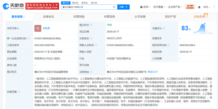 南方财经3月20日电,天眼查App显示,近日,重庆凤凰技术有限公司成立,法定代表人为朱乾勇,注册资本5000万人民币,经营范围含人工智能基础资源与技术平台、人工智能理论与算法软件开发、人工智能公共数据平台、软件开发、机械设备研发、汽车零部件研发、智能机器人的研发、信息系统集成服务等。股东信息显示,该公司由赛力斯(601127)全资持股。