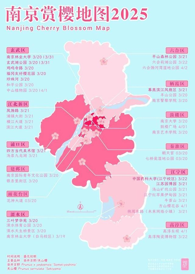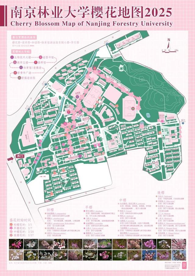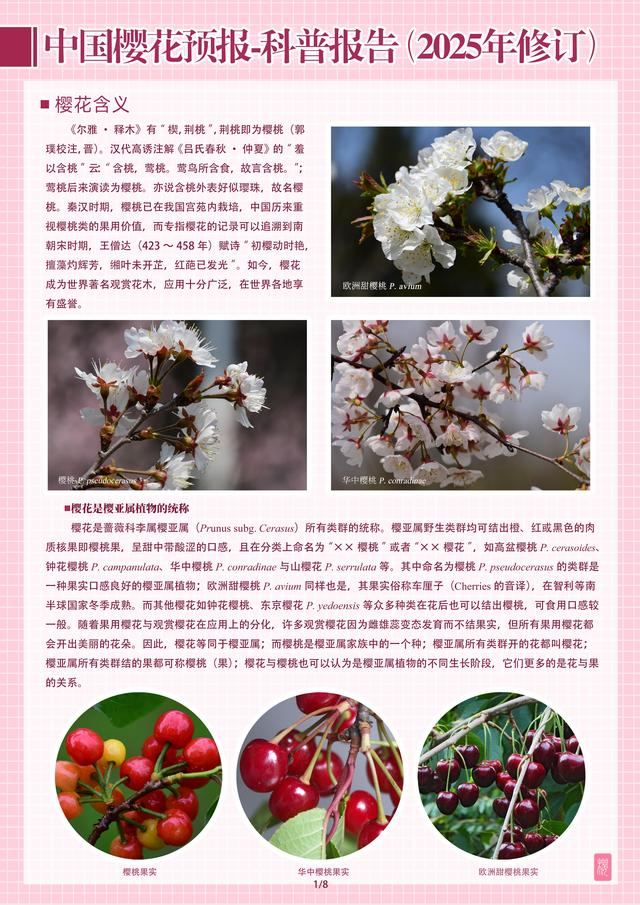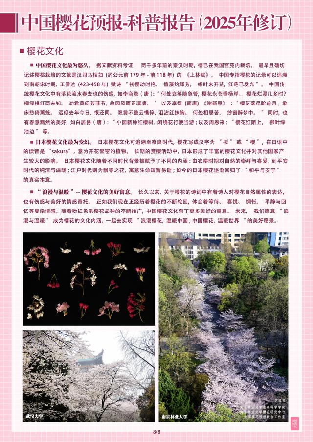 “根据《尔雅主·释木》的记载,“楔,荆桃”,荆桃即为樱桃(郭璞校注,晋)。秦汉时期,樱桃已在我国宫苑内栽培,专指樱花的记录可以追溯到南朝宋时期。如今,樱花成为世界著名观赏花木,应用十分广泛,在世界各地享有盛誉。”为方便市民在赏花的同时了解樱花的品种和起源,南京林业大学樱花研究中心还提供了《中国樱花预报-科普报告(2025年修订)》,该报告详细阐述了樱花的含义、种类、品种、起源、樱花文化等生态科普资料,在赏花的同时了解我国樱花观赏与种植的悠久历史。