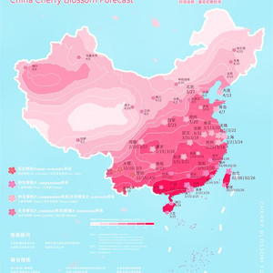 “中国赏樱版图呈现四大区域。长江流域为中国赏樱主要区域。种植有初樱、早樱、中樱与晚樱各类品种。西南地区樱花鉴赏最具特色,主要种植有冬樱品种。3月初春天的红花高盆樱桃让云南地区樱花再次迎来盛花期。华南地区樱花花期最为跳跃。广州主要种植钟花樱桃种系的粉红色樱花(飞寒樱)为主。由深圳、香港、澳门、三亚以及福州、厦门等华南地区城市主要种植钟花樱桃种系的粉红色樱花(飞寒樱)为主。北方地区樱花种植与观赏最具潜力。西北及东北大部分地区樱花种植数量较少,且目前以晚樱为主,未来将会出现更丰富的樱花品种。”在报告中,根据我国的樱花分布情况,为市民观光樱花开启了一条丰富多彩的赏樱之旅,市民可以根据心仪的樱花品种和景色选择赏花路径,奔赴我国国产樱花的满园春色。