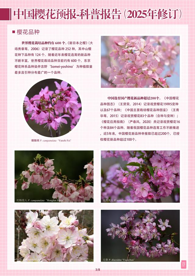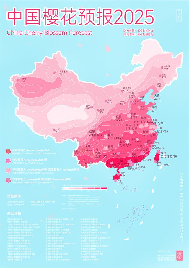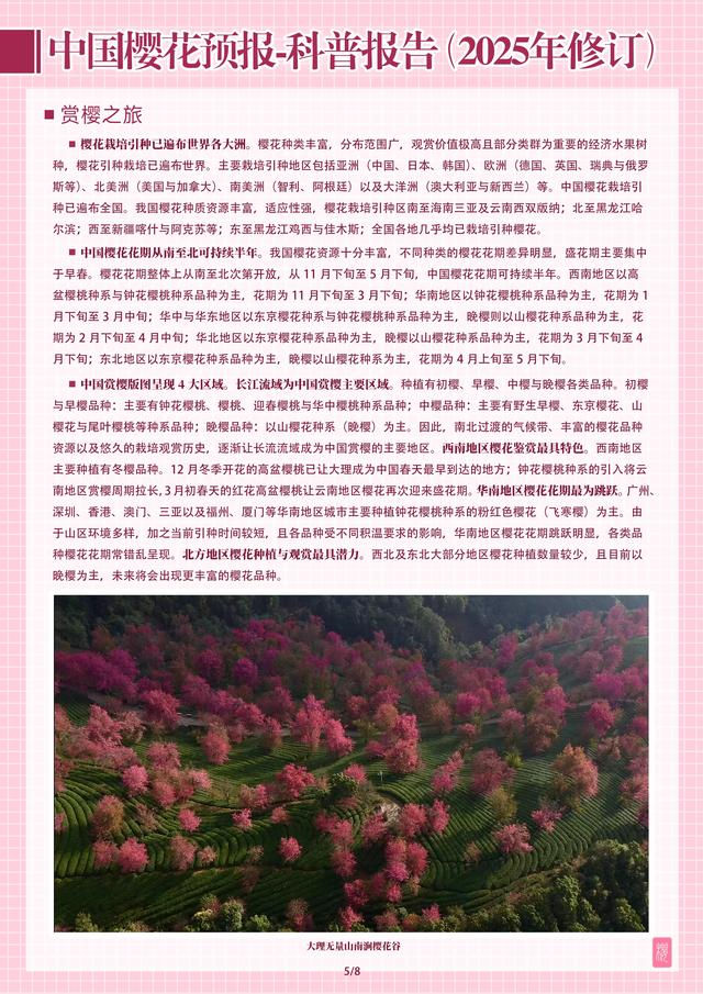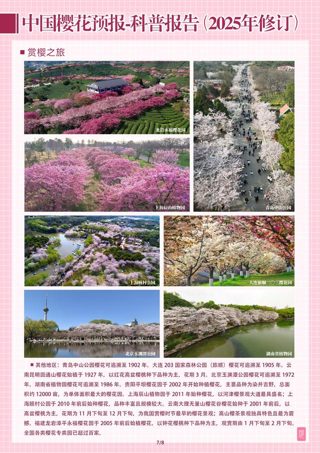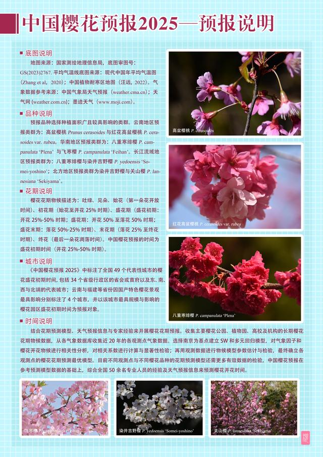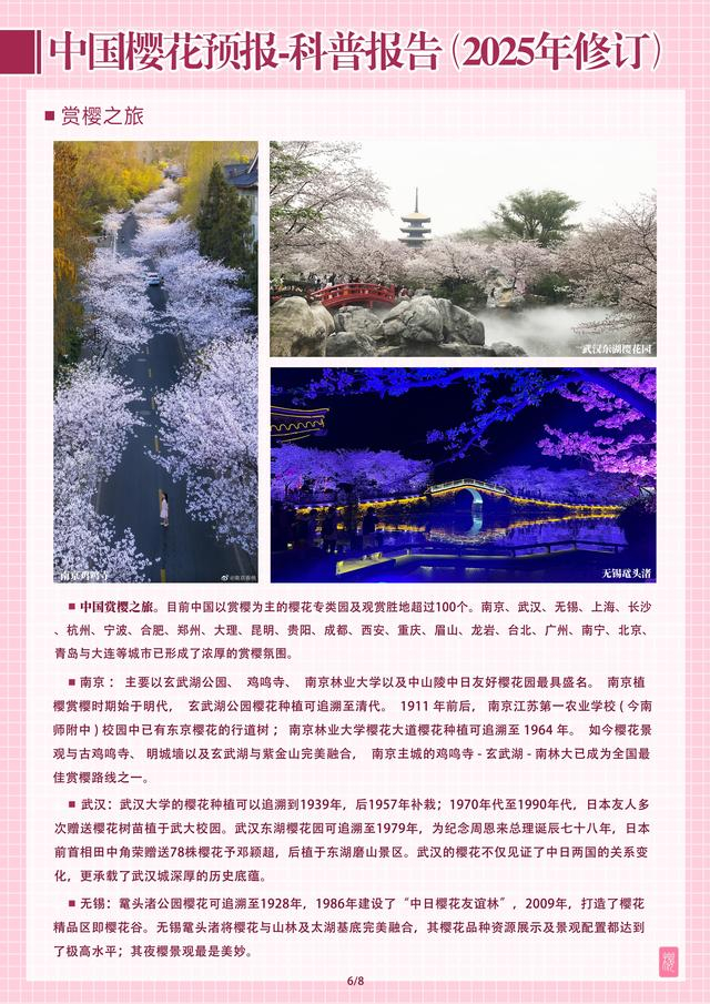 交汇点讯 近日,由南京林业大学生命科学学院樱花研究中心主编的系列科普报告——《中国樱花预报2025》正式发布。该报告联合相关领域内50余位专家,基于花期预测模型、天气预报信息与专家经验,以图文并茂的形式对国内主要赏樱区的最佳观花期进行科学预报。