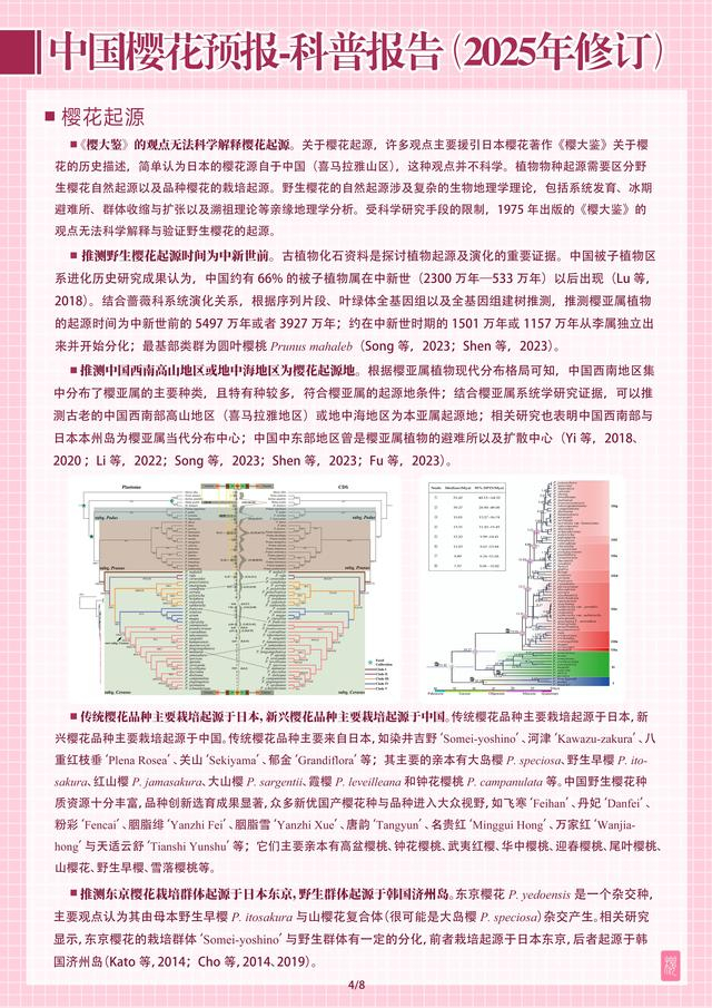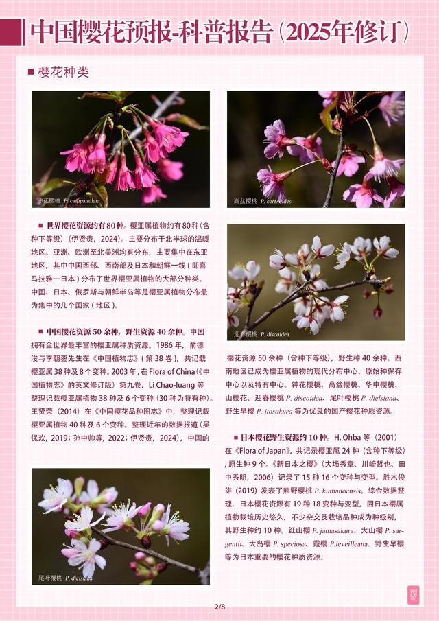 世界樱花资源约有80种,中国樱花资源就有50余种,野生资源40余种。我国拥有全世界最丰富的樱亚属种质资源。对比世界樱花资源,我国的国产樱花具有潜力。在《中国樱花预报-科普报告(2025年修订)》中,详细阐述了樱花的种类和世界樱花资源的对比,从科普角度为市民了解国产樱花资源和品种提供详实的资料支撑。