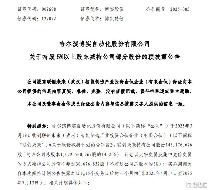 究其导火索,是前一日晚间,博实股份公告称,股东联创未来将减持不超过3%的股份。