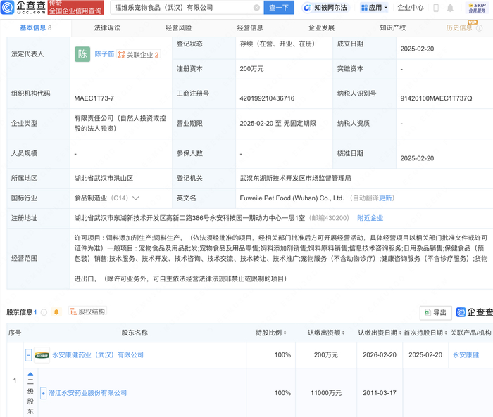 企查查APP显示,近日,福维乐宠物食品(武汉)有限公司成立,法定代表人为陈子笛,注册资本200万元,经营范围包含:宠物食品及用品批发;宠物食品及用品零售;饲料添加剂销售;饲料原料销售等。企查查股权穿透显示,该公司由永安药业(002365)间接全资持股。