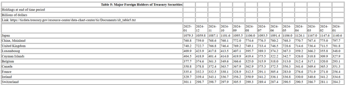 这也造成TIC报告中,海外投资者的美债总持仓1月仅出现了细微变动,从2024年12月的8.5263万亿美元,增加2亿美元至2025年1月的8.5265万亿美元。