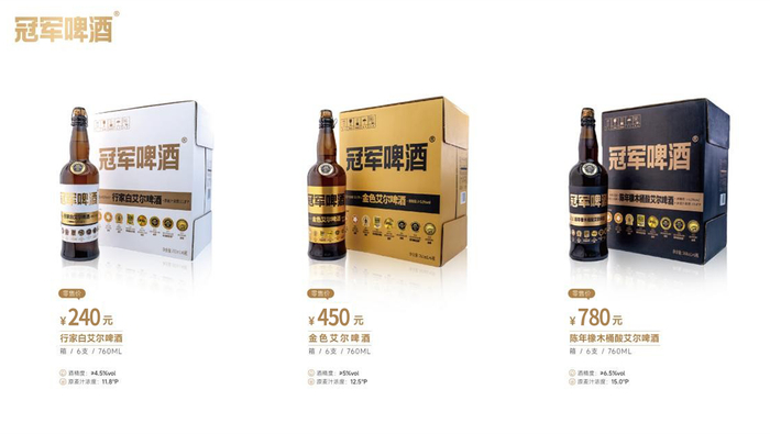 定价中高端。目前冠军啤酒分为“行家白艾尔”“金色艾尔”“陈年橡木桶酸艾尔”三款,规格为760ML/瓶,每瓶市场零售价为40元、75元、130元,适合在中高端场景消费。