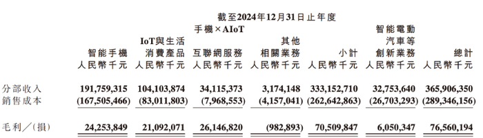2024年全年小米营收3659亿元,其中手机×AIoT为3332亿元占比91%,汽车328亿元只占比9%。而手机×AIoT中,智能手机1918亿元,IoT与生活消费品1041亿元,互联网服务341亿元。