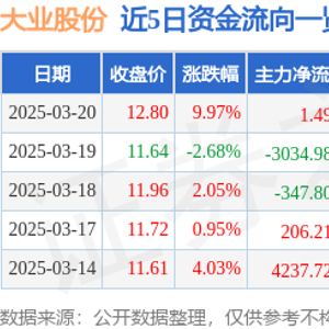 证券之星消息,大业股份3月20日涨停收盘,收盘价12.8元。该股于13点12分涨停,3次打开涨停,截止收盘封单资金为2933.12万元,占其流通市值0.67%。