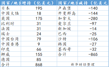 据新华财经统计,前20个持有国家和地区里,11个国家和地区共增持美债868亿美元,9个国家和地区共减持美债865亿美元(详见下表)。