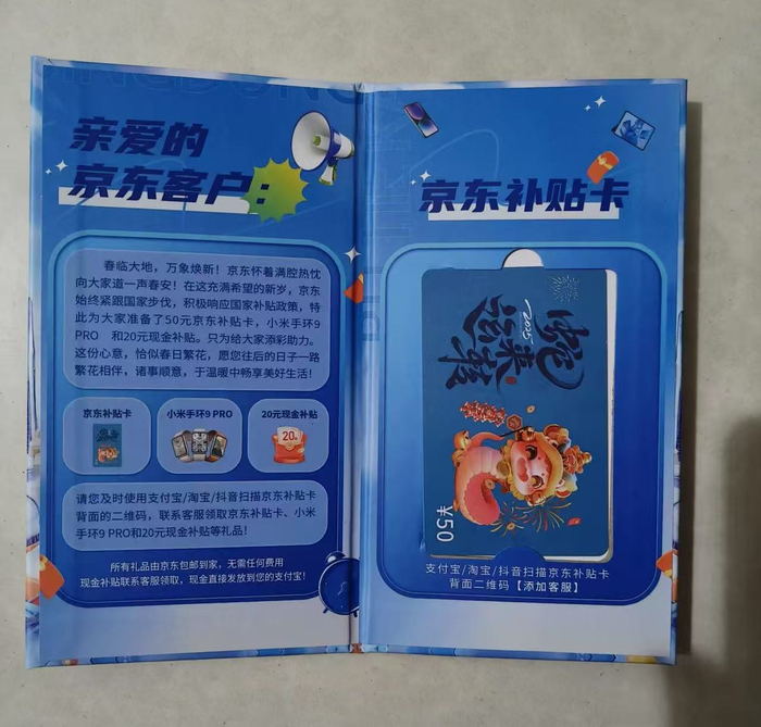 上述用户提供的图片显示,名为“京东补贴卡”的宣传单写着使用“支付宝/淘宝/抖音扫描京东补贴卡背面的二维码,领取补贴卡、手环和现金等礼品。”