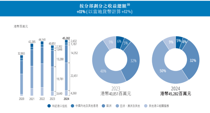 2024年长和港口及相关服务部门录得收益452.82亿港元,较2023年增加11%。2024年长和港口整体吞吐量增加6%,至8750万个标准货柜。
