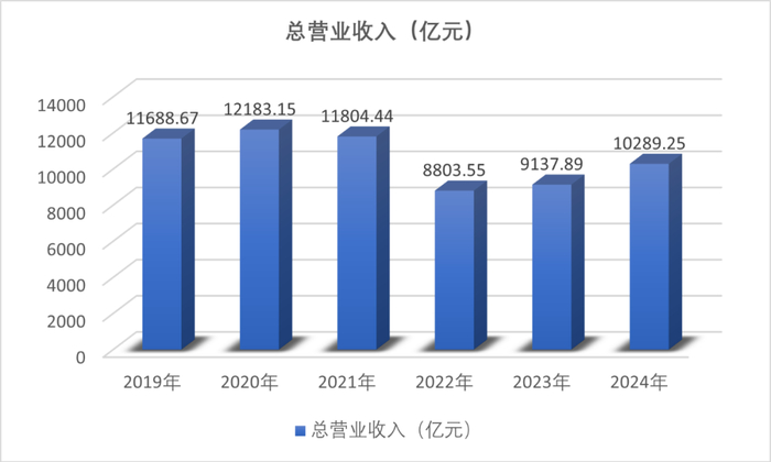 回顾中国平安近六年数据,营业收入分别为11688.67亿元、12183.15亿元、11804.44亿元、8803.55亿元、9137.89亿元、10289.25亿元。
