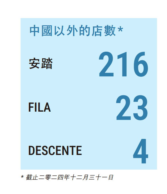 “安踏集团将持续推进全球化战略。”财报指出,去年以东南亚作为海外布局首站,此后安踏还通过与欧美市场头部零售分销商的战略合作,取得了突破性进展,目前,安踏品牌国际化步伐提速,以中国市场为核心辐射全球,布局东南亚、北美、欧洲、中东、非洲等核心海外市场。截至2024年底,集团在中国以外的门店数量已超过240家。