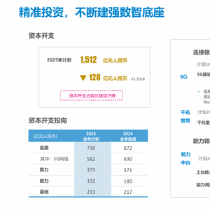 中国移动介绍,公司2025年资本开支计划约1512亿元,比2024年下降128亿元。在算力领域,2025年计划投入373亿元,与2024年算力领域371亿元的投资额基本持平,公司计划至2025年末智算规模超过34EFLOPS。