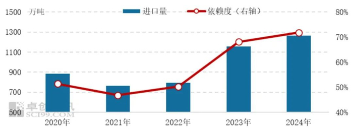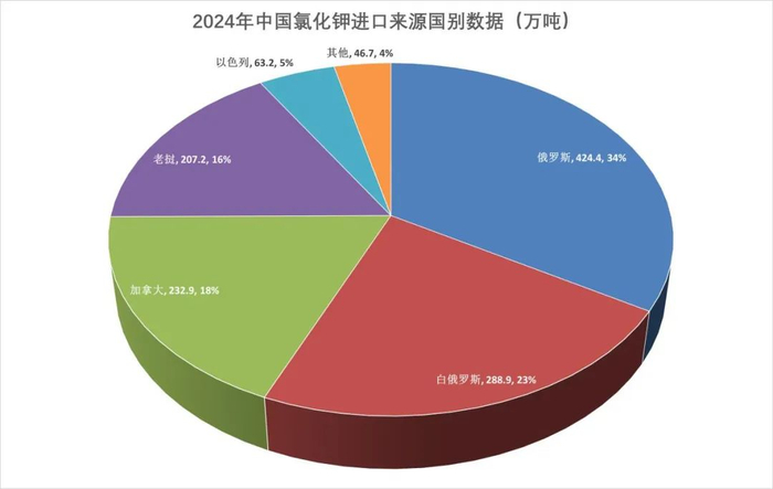 长期以来,我国氯化钾进口依赖度始终在50%左右,2023年这一比例上升至63%,2024年更是进一步攀升至72%。加拿大、白俄罗斯、俄罗斯是我国钾肥进口的主要来源,虽然比例每年各有不同,但三国对中国的钾肥供应量在进口总量中常年占比70%以上,2024年这一比例为76%。