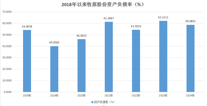 这使得公司过去几年负债率连续走高,不过随着2024年行业景气度提升,公司经营现金流明显好转,负债指标开始掉头下行。数据显示,截至2024年末,牧原股份资产负债率为58.68%,较上年同期下降3.43个百分点。