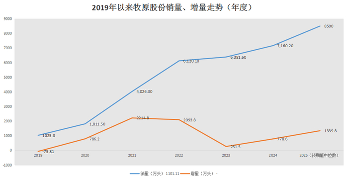 尽管销量基数已处于高位,但牧原股份2025年仍有望实现至少12%的销量增长。“2025年,公司预计出栏商品猪7200万头~7800万头,仔猪800万头~1200万头。”牧原股份2024年年报指出。