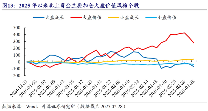 风格层面,北上资金主要加仓大盘价值风格个股,累计加仓规模约277亿元,在2月下旬则开始减持大盘成长类风格个股,从高点累计流出约200亿元。小盘成长小幅流入约41亿元,小盘价值则呈现稳定流出状态,累计流出金额约33亿元。