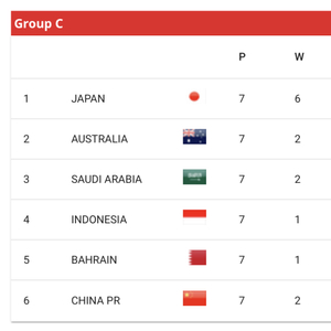 本组日本队主场轻取巴林后7轮19分率先出线,成为全球除3位东道主之外首支获得美加墨世界杯门票球队,先后获胜的澳大利亚队、沙特队分别为10分、9分排名第二、第三,印尼队、巴林队与国足同积6分但净胜球占优排名在国足之前。