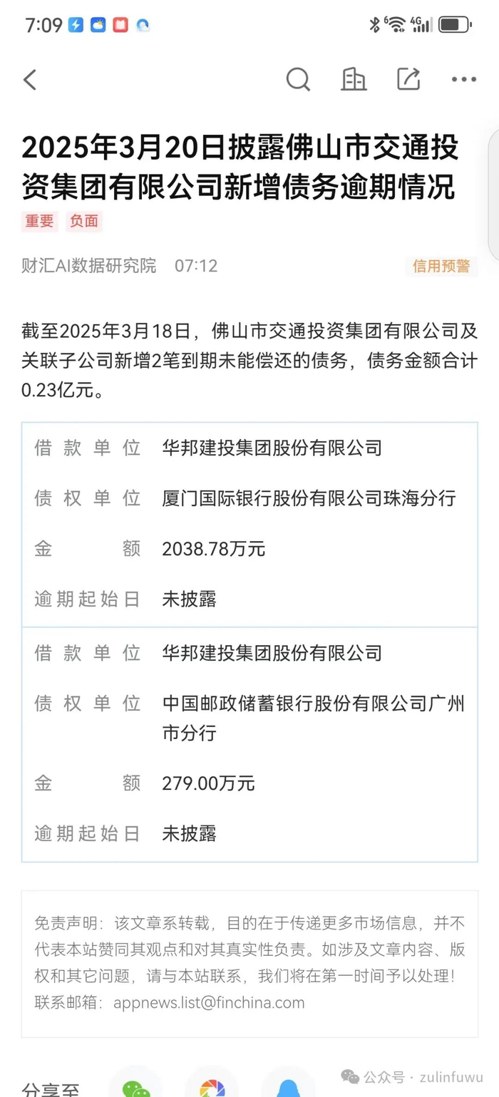 佛山市交通投资集团新增债务逾期情况
