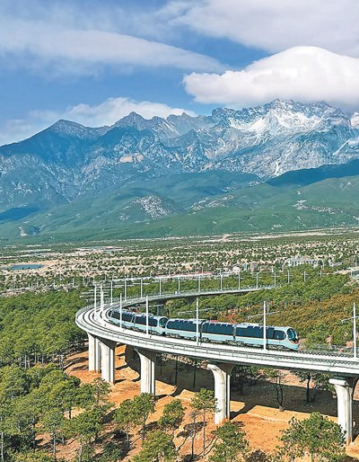 雪山、繁花与牧场,构成了一幅美丽画卷,令人陶醉其中。“风景太美了!”游客赖先生是第二次来云南丽江,这次旅行他体验了丽江雪山观光火车。自2月12日开通以来,丽江雪山观光火车迅速成为旅游界的新“爆款”。这列由我国自主研发的全球首列全景观光山地旅游列车,以其独特的设计和舒适的体验,为游客带来一场别具一格的雪山之旅,更成为连接丽江古城与玉龙雪山的“黄金纽带”。