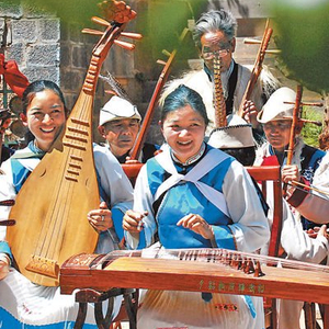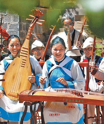 丽江纳西族村民在演奏纳西古乐。