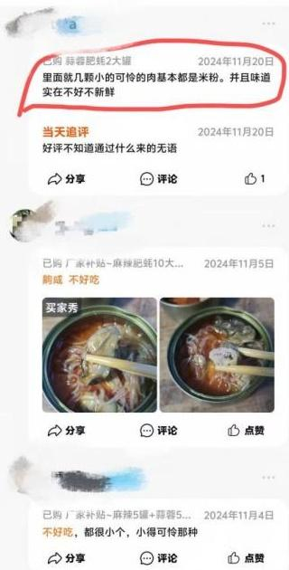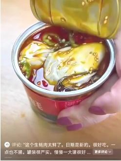 案例3:在淘宝直播/点淘平台的“良心乐旗舰店”引流视频中,商家展示的麻辣肥蚝大罐装看起来极具诱惑力,无论是罐头的深度、颜色色泽,还是生蚝的大小,都让人垂涎欲滴,激发了消费者的购买欲。然而,当消费者收到货后发现,罐头的直径仅有8.5厘米,高度4.2厘米,与视频中的展示大相径庭。开罐后,映入眼帘的是七八个又小又黑又碎、毫无食欲的生蚝,更令人意外的是,底下还铺着一层厚厚的粉丝。