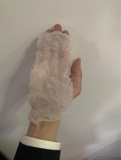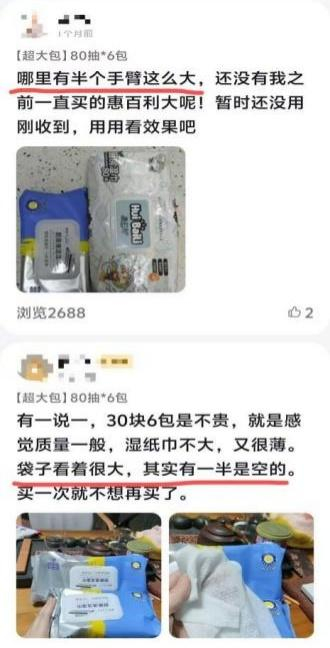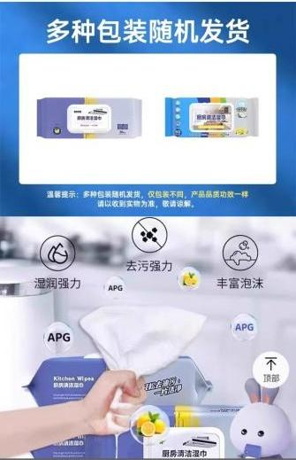 案例1:在多多直播平台的“爱肤佳福瑞通达专卖店”引流视频中,5包厨房清洁湿巾被展示得又大又高,长度看似有两肩宽,但实际收到商品后,消费者却发现商品明显“缩水”。当体察员就此问题询问店铺客服时,商家仅简单回复:“是这样的”。
