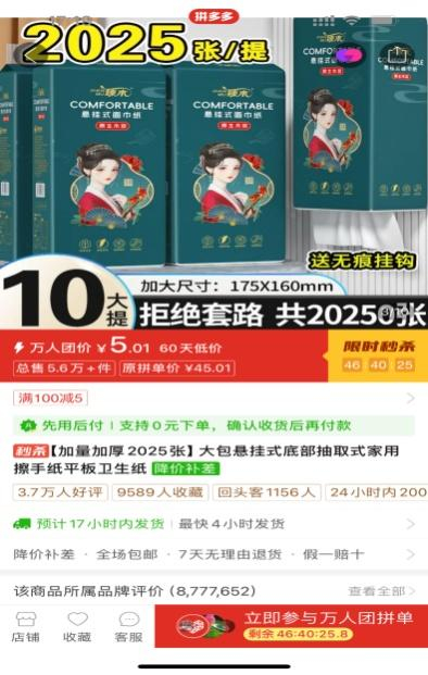 在多多直播平台的“信捷日化专营店”中,主播视频销售臻木悬挂式面巾纸时宣称每包产品含有“2025张”。然而,体察员收到产品后发现,外包装上仅标注了产品规格为160mm*175mm,并未提及“2025张”等任何关于张数的描述。出于好奇和验证的目的,体察员耐心地对实物的实际张数进行了仔细确认,结果发现总抽数约为240抽,且每抽纸由2张纸张紧紧贴合在一起,因此实际总量仅为480张,与主播的宣传存在明显差异。