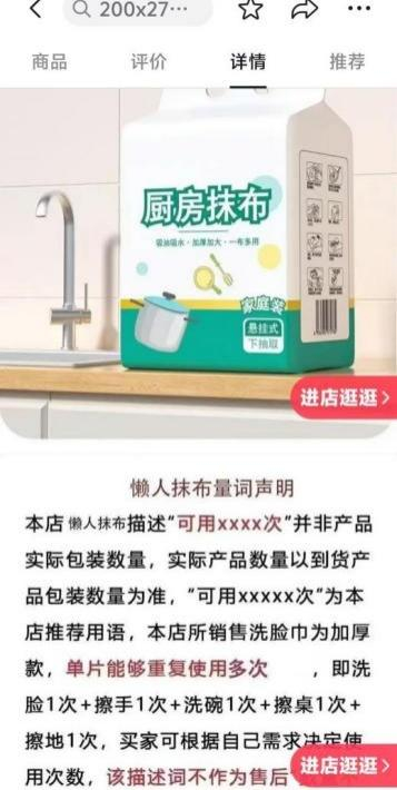 体察员在抖音平台“花田优选小店”中发现,商家以“四大提可用5866次”作为核心卖点来销售厨房抹布。模拟购买后,收到的实物为四大提共480抽。按照商家“可用5866次”的宣传,意味着每张抹布需要反复使用12次。然而,体察员抽取单片抹布进行测量后发现,该压纹单层抹布的长仅为19.5厘米、宽为15厘米,大小还不足普通A4纸的一半,因此反复使用12次的可能性非常小。