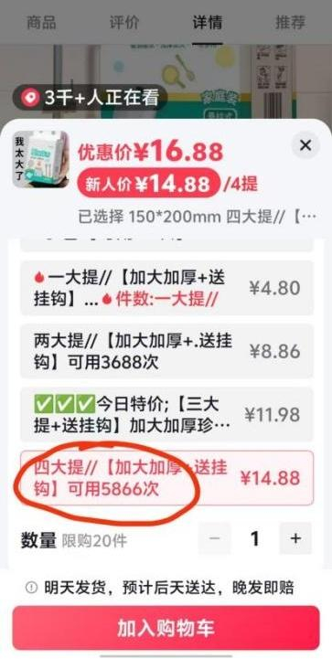 部分商家在商品页面中频繁使用“加大加厚”、“半臂长”、“加厚用一年”等夸张词汇来“洗脑”消费者。例如,在淘宝直播/点淘平台的“淘工厂致富达人”商品宣传页面中,就标注了“加大加厚”、“巨无霸”、“半臂长”等形容词来描述厨房清洁湿巾。然而,消费者收货后发现,湿巾的长度不足三分之一臂长,且展开后“薄如蝉翼”,长度和宽度仅与一手掌相当,与商家所描述的完全不符。