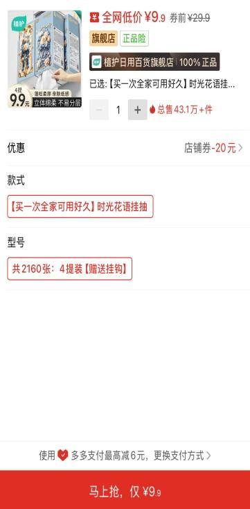 在体察过程中,多多平台的“植护日用百货旗舰店”引流视频中宣称时光花语纸面巾“4提到手才9.9元”。体察员进入下单页面后,发现商品标注的“券前”价格为29.9元/4提,但店家提供了一张20元的大额优惠券。在如此大的价格优惠诱惑下,体察员毫不犹豫地下了单。然而,后续在其他平台进行体察时,体察员发现同款产品的4提价格直接就是9.9元,无需使用任何优惠券。