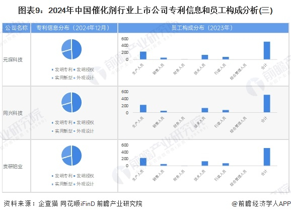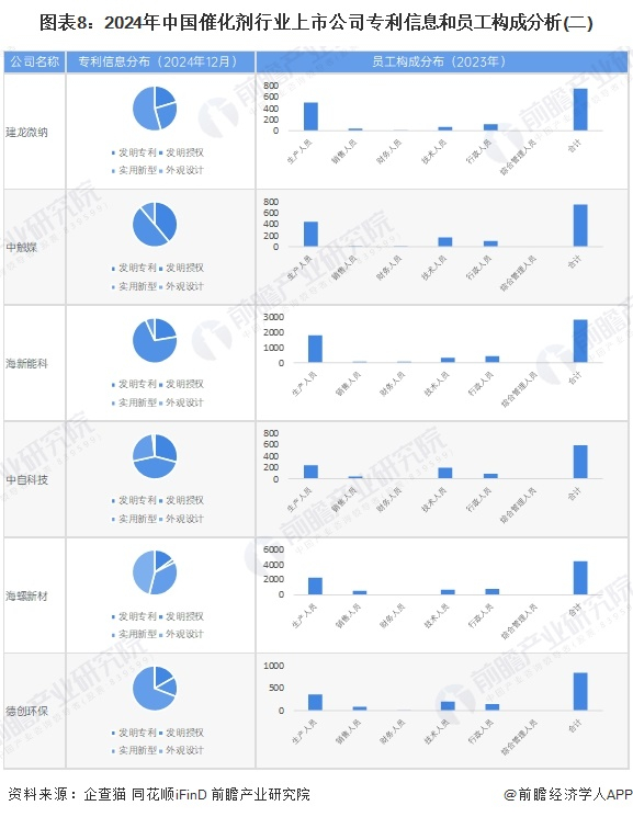 从催化剂行业的上市企业已有的公开信息分析,专利信息相对较多的企业是元琛科技和海新能科,其中元琛科技发明专利数量最多,为559条;上市公司中员工总数最多的企业是海螺新材,员工总数为4475人。