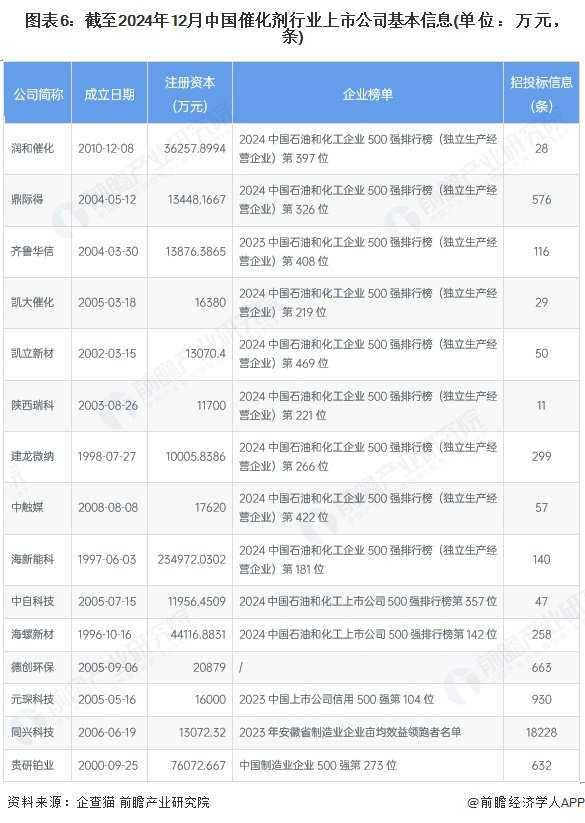 从催化剂行业的上市企业布局和已有公开信息分析,成立时间最早的是海螺新材,注册资本最多的是海新能科;上市公司中招投标信息最多的是同兴科技。