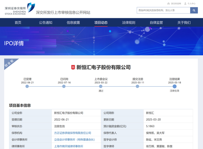 新恒汇电子(创业板IPO企业)于2023年3月22日过会,2025年3月11日提交注册,注册仅8天后(3月19日)即获批,从过会到注册生效耗时近728天,成为“IPO钉子户”中的典型案例。其快速获批可能与监管层加速处理存量项目及企业自身解决历史问题有关。