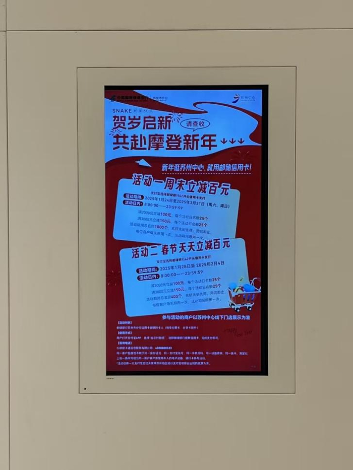 邮储银行苏州市分行自2025年春节期间起,积极响应国家关于金融支持首店经济、激发消费市场新动能的政策号召,与比斯特苏州购物村以及苏州中心星悦汇联合推出“信用卡春节天天立减”及“周末立减”特惠活动,此次活动不仅为消费者带来了实实在在的优惠,还进一步激发了苏州地区的消费市场活力,进一步推动了首店经济的发展。活动期间,消费者对活动的参与热情高涨,商场节日氛围浓厚,形成了良好的消费循环。