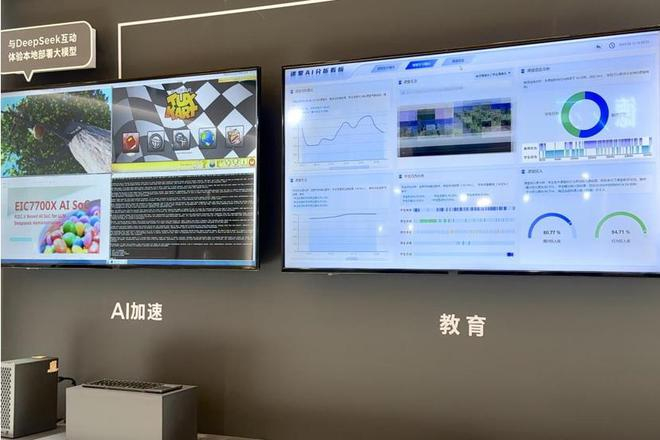 此次AWE上,奕斯伟计算也展示了基于EIC7700X及EIC7702X的面向不同垂直行业场景的产品,包括AI加速/视频转码卡、AI BOX、SOM核心板、OSM开放标准模组、SBC单板计算机、本地部署DeepSeek大模型的AI PC等多样化产品。