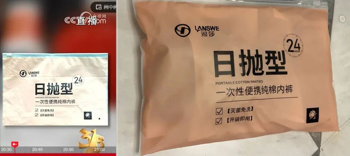 央视曝光图片与浪莎在售日抛型一次性内裤比较。