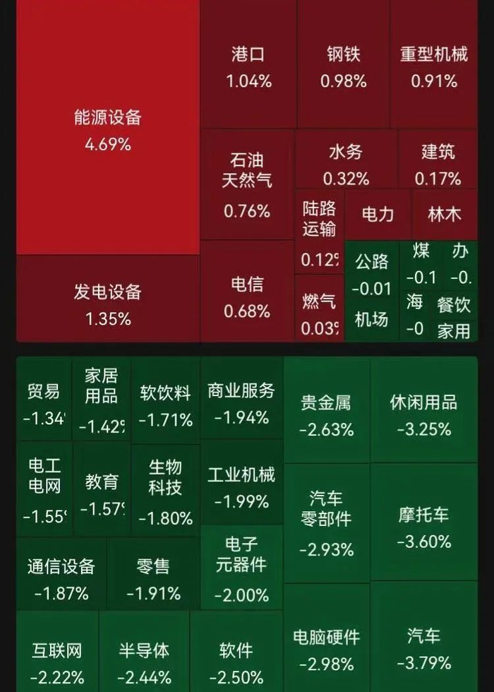 盘面上,能源设备板块大涨,港口拉升,汽车、摩托车、休闲用品板块跌幅居前。