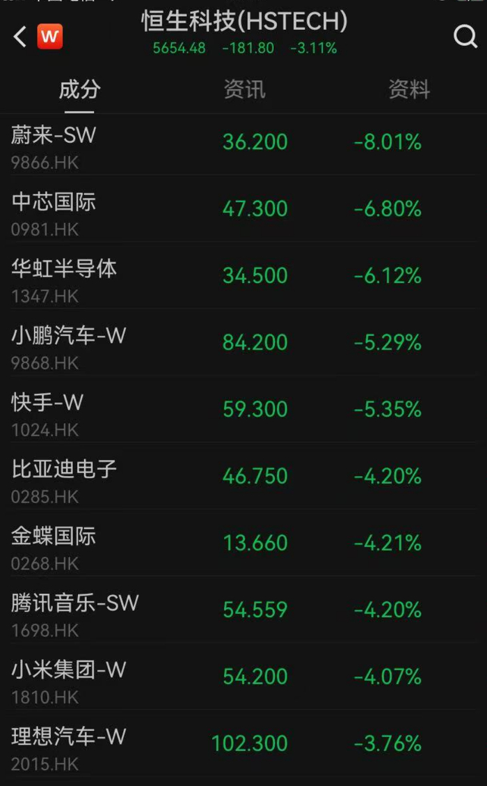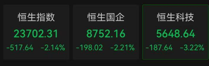 港股也较大幅度调整。截至发稿,恒生指数跌超2%,恒生科技指数跌超3%。
