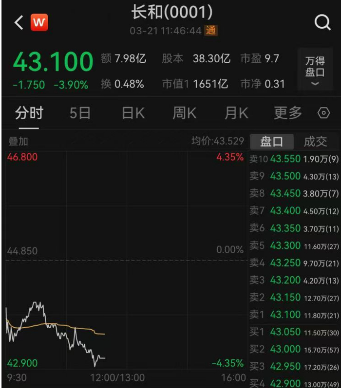而长和最近11个交易日市值蒸发323.6亿港元。目前每股报43.1港元,总市值1651亿港元。