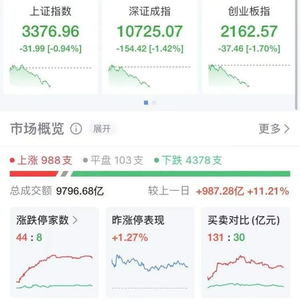 市场上988只个股上市,4378只个股下跌,成交9796.68亿元。