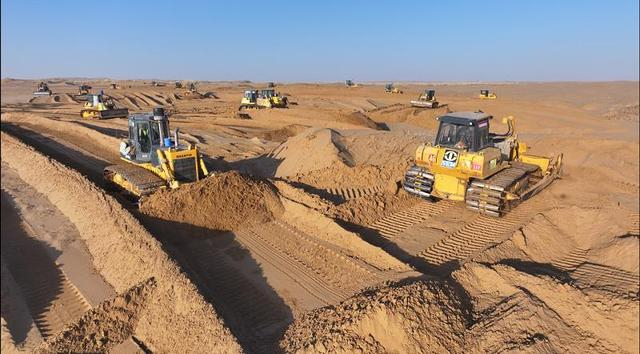 阳春三月,在内蒙古能源集团杭锦旗防沙治沙风电光伏一体化项目建设现场,260余台推土机将库布其沙漠深处的金色沙浪整齐地推平、铺展开来。西北地区最大的单体“光伏蓝海”将在今年9月并网发电,届时该项目将实现年供绿电25亿度,可节约标准煤74万吨。