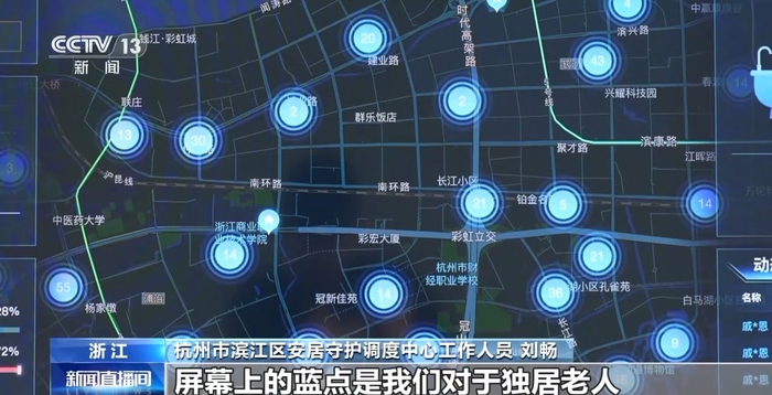 杭州市滨江区安居守护调度中心工作人员 刘畅:屏幕上的蓝点是我们对独居老人家庭地址的精准定位,智能门磁和红外感应可以监测到老人有没有异常情况,比如长时间没有活动、长时间没有出门,也会触发平台的报警。