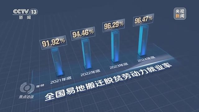 根据国家发展改革委的统计数据,2021年以来,全国易地搬迁脱贫劳动力就业率持续保持在90%以上,且呈现逐年增长趋势。截至2024年底,全国易地搬迁脱贫劳动力就业率达96.47%,与2021年底相比提高约4个百分点,有劳动力的搬迁家庭基本实现了1人以上就业目标。